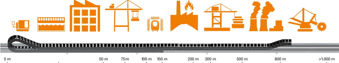 Extreme dirt and dust exposure do not affect the energy chain systems. For several years now, they have reliably supplied conveyor units and stockpiling equipment with energy, data and media.