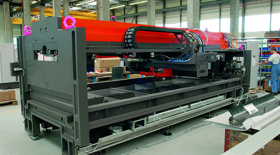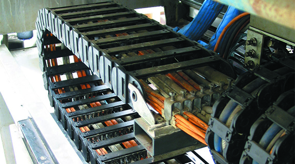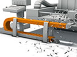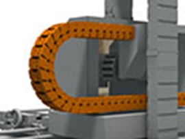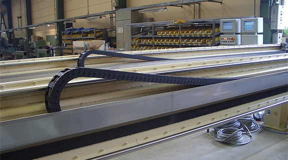 Several plastic energy chains ensure cable guidance at high travel speeds and accelerations in Grenzebach Maschinenbau GmbH cutting machines.